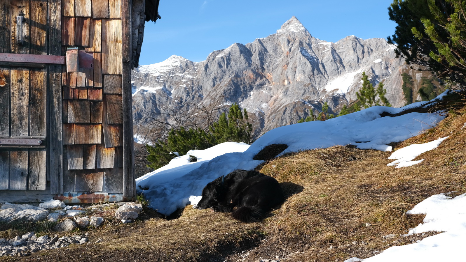 Oberhalb der Lechneralm wird der Wanderweg steil. Überwiegend auf Lehmboden, etwas verwurzelt, ein wenig Gras, doch kaum steindurchsetzt, kämpfen wir uns rasch an Höhe gewinnend bergauf. Im oberen Teil windet der Weg sich durch Latschen und plötzlich zeigt sich eine kleine Holzhütte. Für viele Wanderer ist hier das Ziel, doch wir können durchaus noch ein paar Höhenmeter höher steigen. Die mächtigen Felswände des Steinernen Meeres rücken dann noch näher ins Bild.