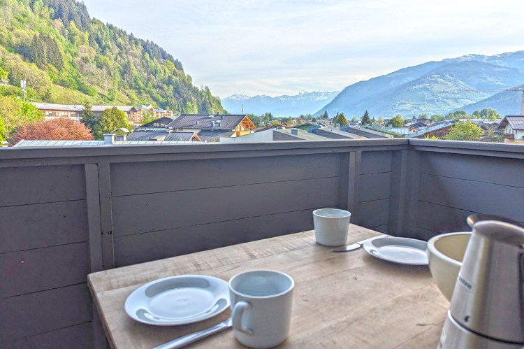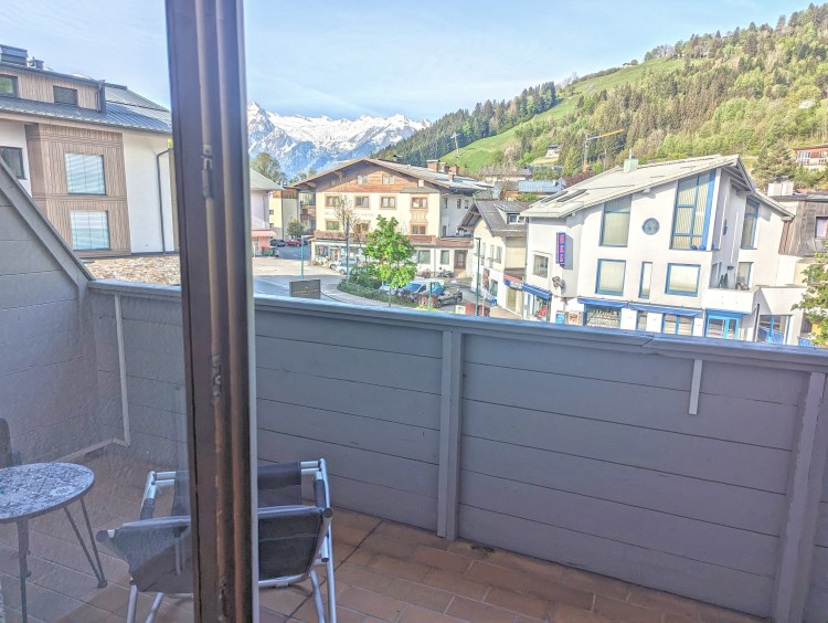 A large balcony is accessible from the living area. It faces north and is completely covered. Ideal for airing your hiking boots, but you won’t get much sun here. However, the view with the Hochkönig in the distance is pretty.