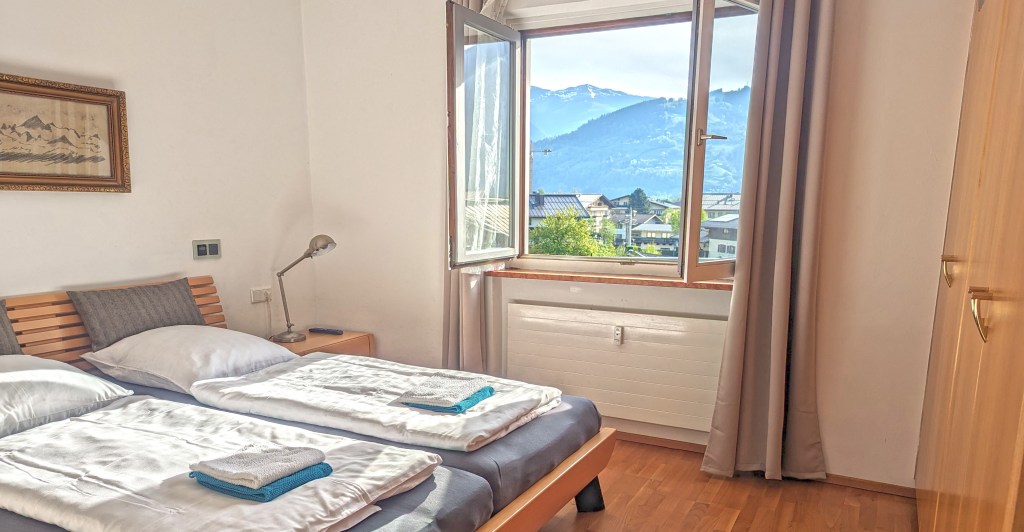 The view is pretty – even though it’s in the center of Schüttdorf. In the distance you can see the Hochkönig mountain range, and from the bedroom you can see the Salzburg Slate Alps very close.