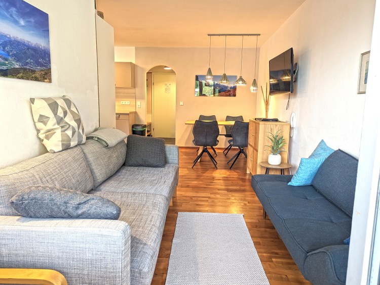 Zwei Sofas und ein Sessel laden zu gemütlichen Stunden ein. Der TV (Kabel) ist schwenkbar, so dass Sie von den Sofas oder vom Esstisch fernsehen können.