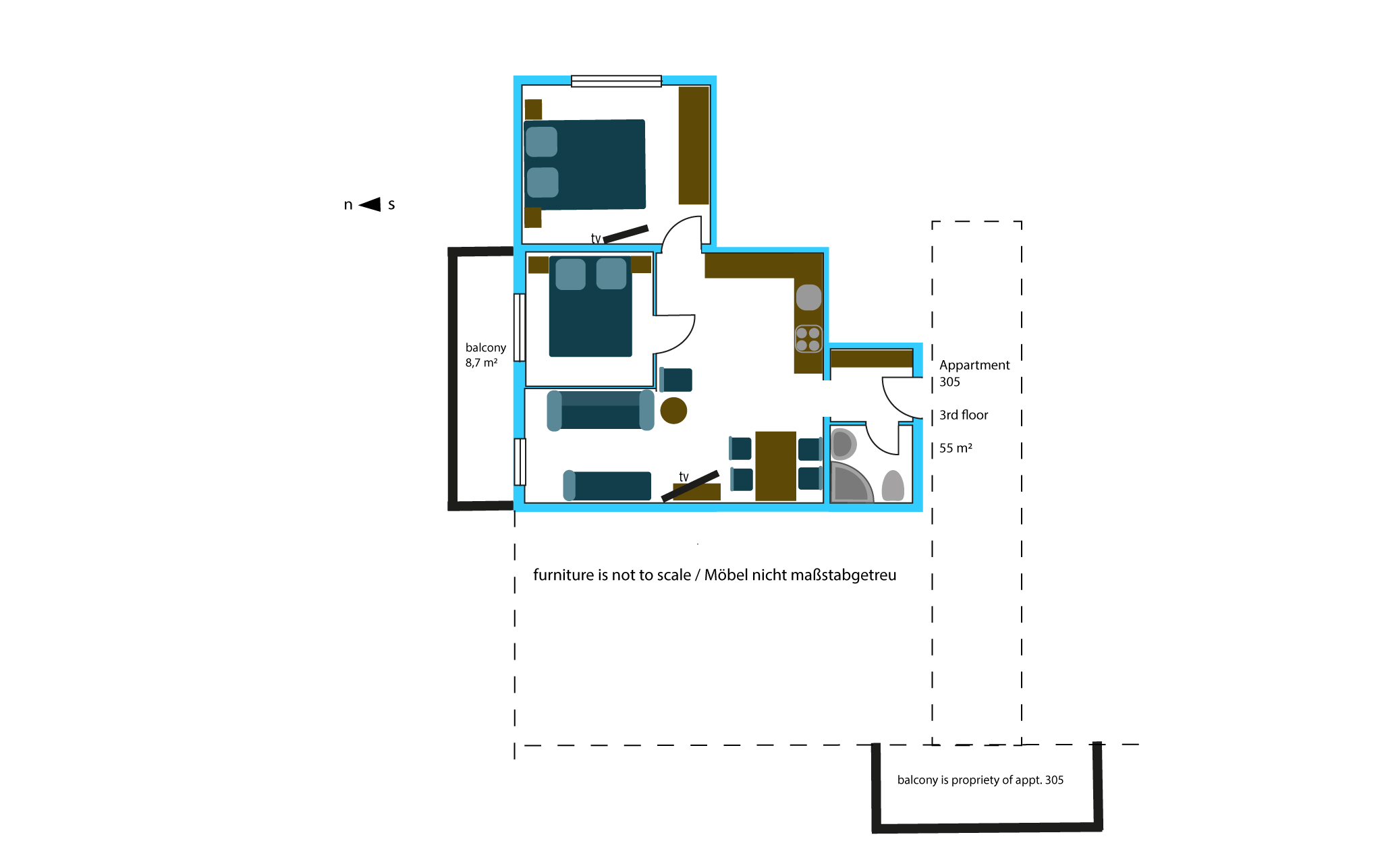 Click here for a 360° round-trip through the appartement (you will be tranferred to YouTube)